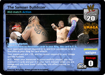 Cannot be blanked. When you have no Revolution cards in your Ring, this card is F: 0, your opponent cannot respond to it, and it is considered to be a Storyline in your Ring for card effects. Your maneuvers are +1D, and he cannot respond to your Umaga-specific Actions. ACE: When your maneuver is unsuccessfully played, you may overturn 3 cards and put it in your hand instead; when you are Umaga and you have lower Fortitude, this effect cannot be reversed.