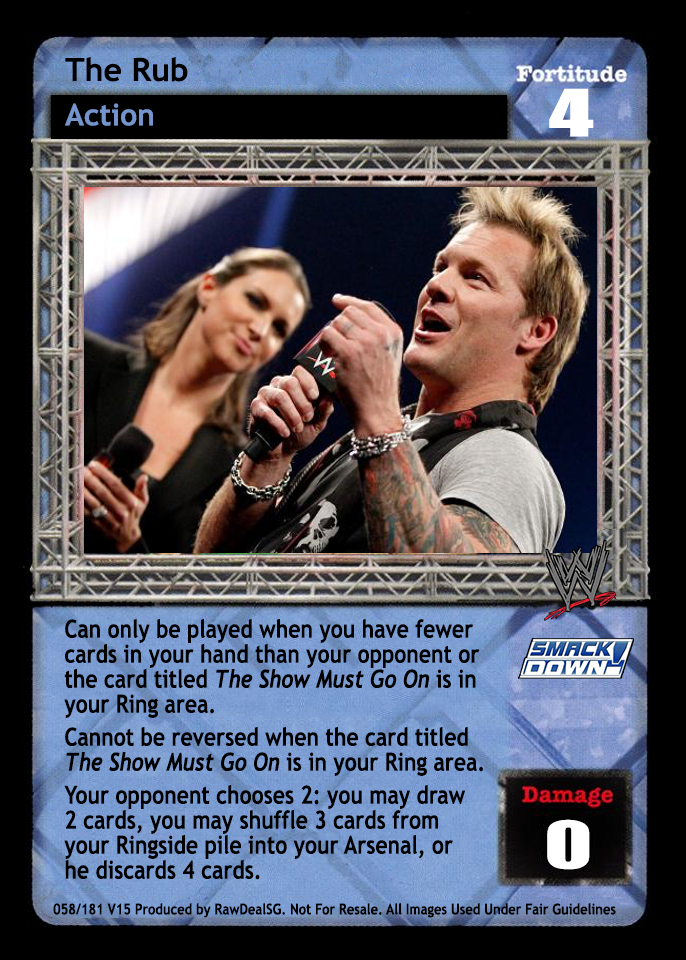 Can only be played when you have fewer cards in your hand than your opponent or the card titled The Show Must Go On is in your Ring area. Cannot be reversed when the card titled The Show Must Go On is in your Ring area. Your opponent chooses 2: you may draw 2 cards, you may shuffle 3 cards from your Ringside pile into your Arsenal, or he discards 4 cards.