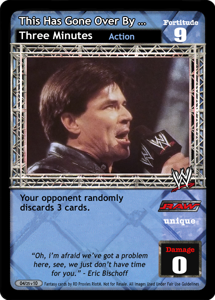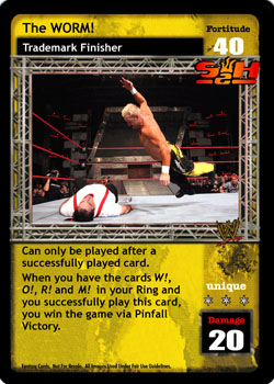 Can only be played after a successfully played card. When you have the cards W!, O!, R! and M! in your Ring and you successfully play this card, you win the game via Pinfall Victory.