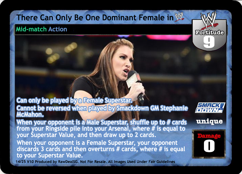 Can only be played by a Female Superstar. Cannot be reversed when played by Smackdown GM Stephanie McMahon. When your opponent is a Male Superstar, shuffle up to # cards from your Ringside pile into your Arsenal, where # is equal to your Superstar Value, and then draw up to 2 cards. When your opponent is a Female Superstar, your opponent discards 3 cards and then overturns # cards, where # is equal to your Superstar Value.