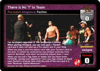 Can be played regardless of The Boogeyman's Ability. When packing this card, you can only pack 1 Faction card and it does not take up a Pre-match slot in your Ring. When you play a non-Pre-match card with your Faction's title in the text, it cannot be reversed by non-Unique reversals from hand or Backlash, and when successfully played draw 1 card. When you are not a Tag Team or Stable and you have lower Fortitude, during his turn you may choose to blank your Faction's reversal card until the end of the turn and it is now 'Reversal: hybrid Maneuver'.