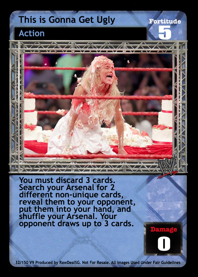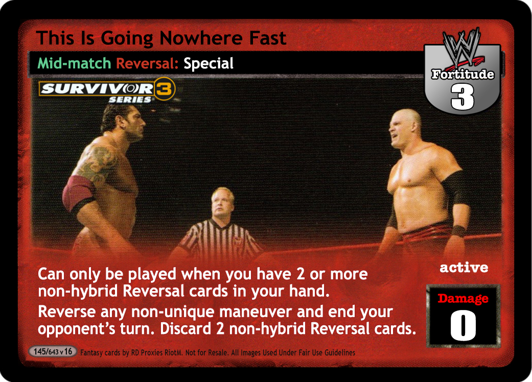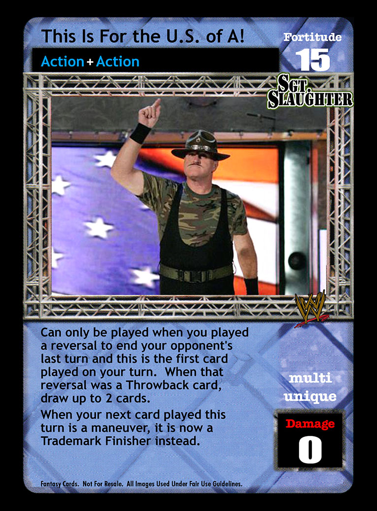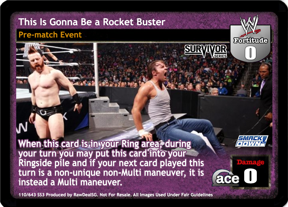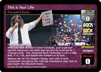 Cannot be blanked. When you have at least 5 lower Fortitude, your Superstar-specific maneuvers are Multi and can only be reversed by 2 reversal cards. Your Patented Rock Footstomp is now a High Risk, F: 0, +3D, and double the numbers in its text. Replace the 'or The People's Champ' text with 'and Sock Connection' and ignore the 'with the Smackdown logo' text on your Layin' the Smacketh Down.