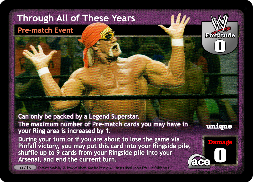 Can only be packed by a Legend Superstar. The maximum number of Pre-match cards you may have in your Ring area is increased by 1. During your turn or if you are about to lose the game via Pinfall victory, you may put this card into your Ringside pile, shuffle up to 9 cards from your Ringside pile into your Arsenal, and end the current turn.