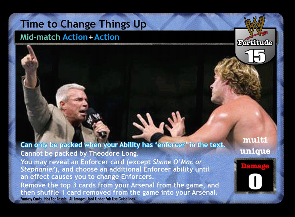 Can only be packed when your Ability has 'enforcer' in the text. Cannot be packed by Theodore Long. You may reveal an Enforcer card (except Shane O'Mac or Stephanie?), and choose an additional Enforcer ability until an effect causes you to change Enforcers. Remove the top 3 cards from your Arsenal from the game, and then shuffle 1 card removed from the game into your Arsenal.