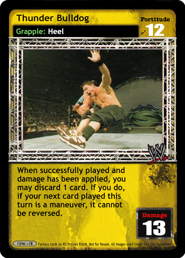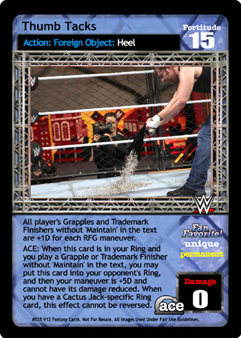 All player's Grapples and Trademark Finishers without 'Maintain' in the text are +1D for each RFG maneuver. ACE: When this card is in your Ring and you play a Grapple or Trademark Finisher without 'Maintain' in the text, you may put this card into your opponent's Ring, and then your maneuver is +5D and cannot have its damage reduced. When you have a Cactus Jack-specific Ring card, this effect cannot be reversed.