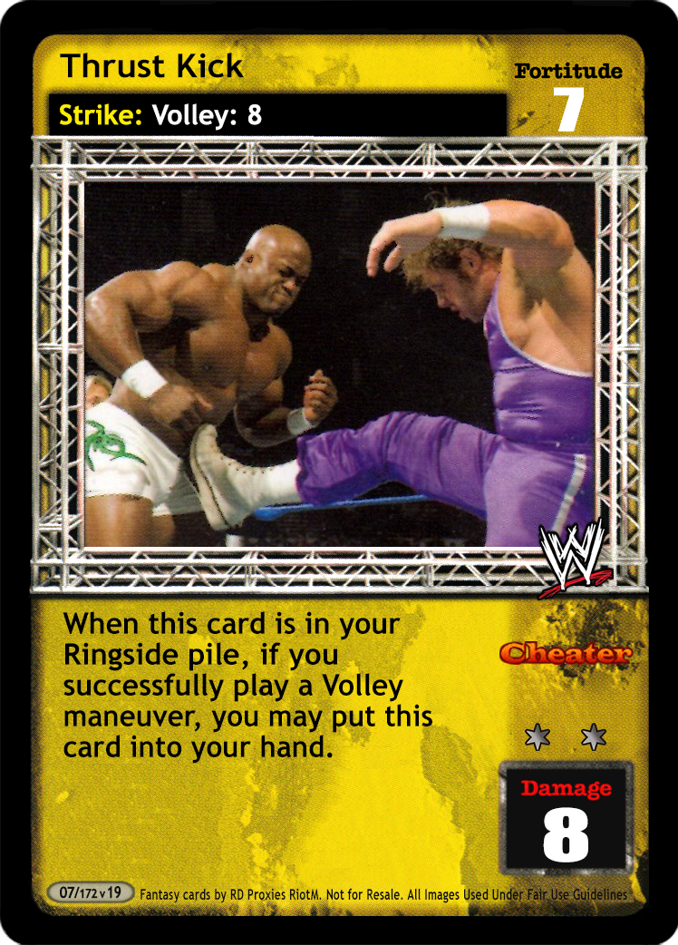 Cannot be packed by Female Superstars. When this card is in your Ringside pile, during your turn you may put this card on the bottom of your Arsenal and then randomly remove 2 cards in your opponent's Ringside pile from the game.