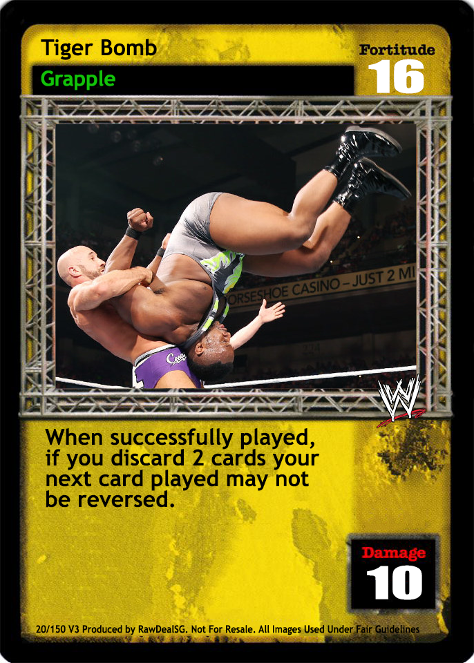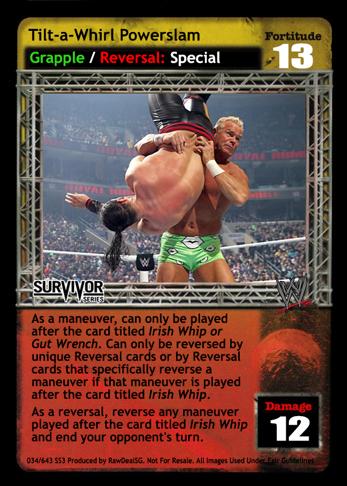 As a maneuver, can only be played after the card titled Irish Whip or Gut Wrench. Can only be reversed by unique Reversal cards or by Reversal cards that specifically reverse a maneuver if that maneuver is played after the card titled Irish Whip. As a reversal, reverse any maneuver played after the card titled Irish Whip and end your opponent's turn.