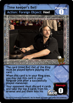 The card titled Roll Out of the Ring must be played before playing this card. When this card is in your Ring area, you may put this card in your Ringside pile after a successfully played maneuver, your opponent must discard 4 cards and take the top 4 cards from his Arsenal and put them into his Ringside pile.