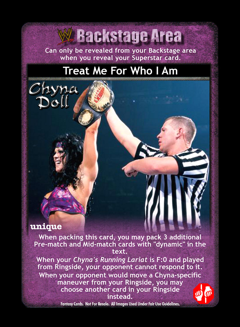 When packing this card, you may pack 3 additional Pre-match and Mid-match cards with 'dynamic' in the text. When your Chyna's Running Lariat is F:0 and played from Ringside, your opponent cannot respond to it. When your opponent would move a Chyna-specific maneuver from your Ringside, you may choose another card in your Ringside instead.