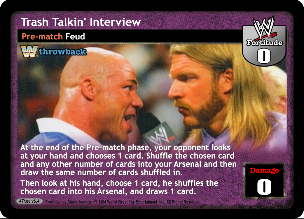 Cannot be played when any player is Triple H, The Game, DX, The King of Kings, or Revolution Triple H. At the end of the Pre-match phase, your opponent randomly reveals 2 cards from his hand, then you may shuffle up to 4 cards from your hand into your Arsenal and draw the same number of cards. ACE: During your turn you may put this card into your Ringside and then his Superstar Ability is blank for the rest of the turn.