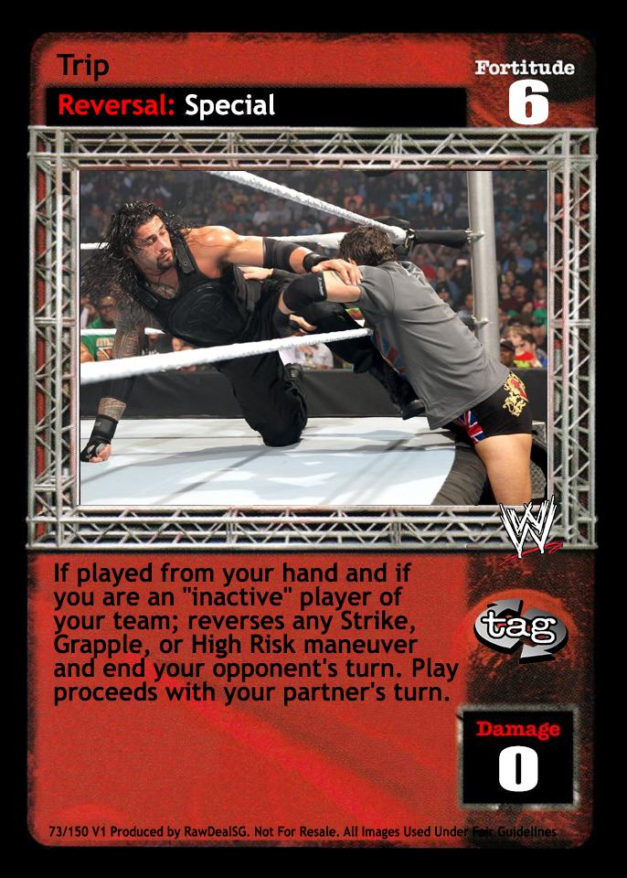 If played from your hand and if you are an "inactive" player of your team; reverses any Strike, Grapple, or High Risk maneuver and end your opponent's turn. Play proceeds with your partner's turn.
