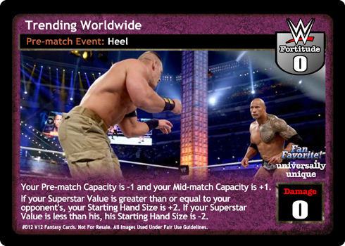 Your Pre-match Capacity is -1 and your Mid-match Capacity is +1. If your Superstar Value is greater than or equal to your opponent's, your Starting Hand Size is +2. If your Superstar Value is less than his, his Starting Hand Size is -2.