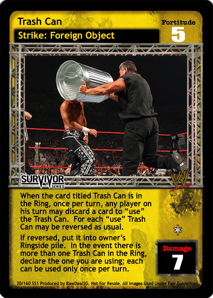 When the card titled Trash Can is in the Ring, once per turn, any player on their turn may discard a card to "use" the Trash Can. For each "use" Trash Can may be reversed as usual. If reversed, put it into owner's Ringside pile. In the event there is more than one Trash Can in the Ring, declare the one you are using; each can be used only once per turn.
