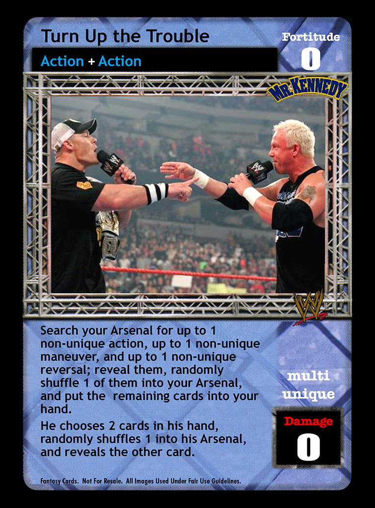 Search your Arsenal for up to 1 non-unique action, up to 1 non-unique maneuver, and up to 1 non-unique reversal, reveal them to your opponent, randomly shuffle 1 card back into your Arsenal, and put the remaining cards into your hand. He chooses 2 cards in his hand, randomly shuffles 1 into his Arsenal, and reveals the other card.