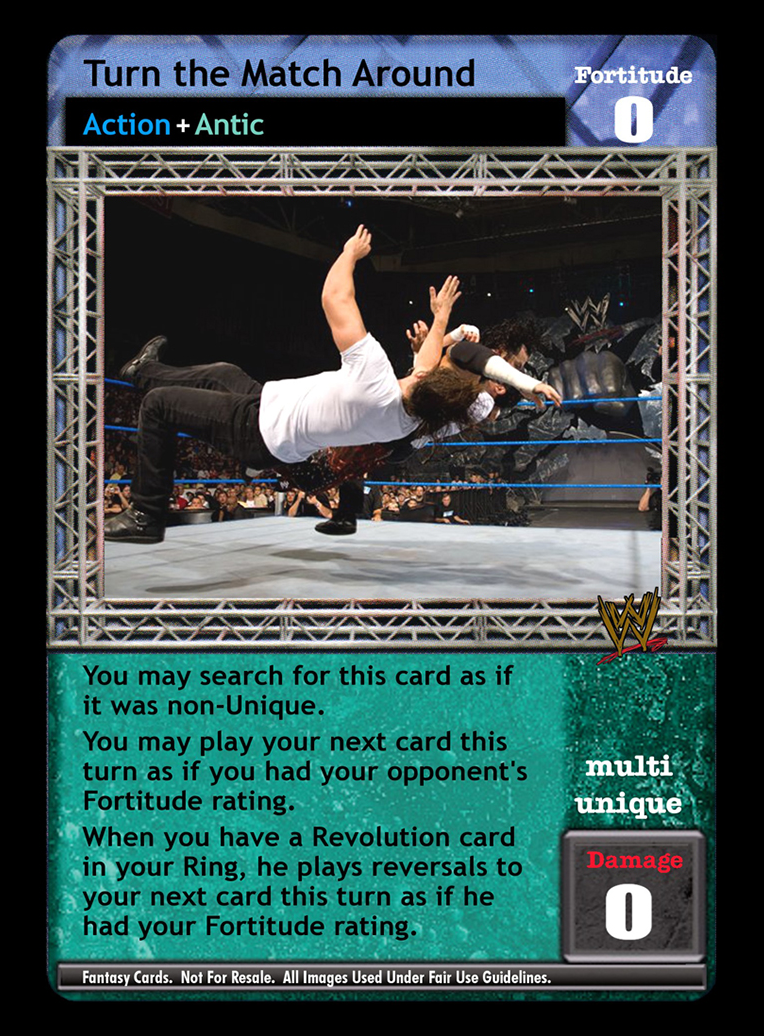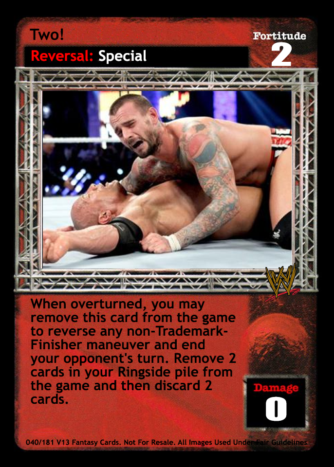 When overturned, you may remove this card from the game to reverse any non-Trademark-Finisher maneuver and end your opponent's turn. Remove 2 cards in your Ringside pile from the game and then discard 2 cards.