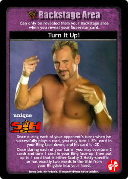 Once during each of your opponents turns when he successfully plays a card, you may turn 1 2D+ card in your Ring face-down, and his card is -2D. Once during each of your turns, you may overturn 2 cards and turn 1 card in your Ring face-up, then put up to 1 card that is either Scotty 2 Hotty-specific or has exactly two words in the title from your Ringside into your hand.
