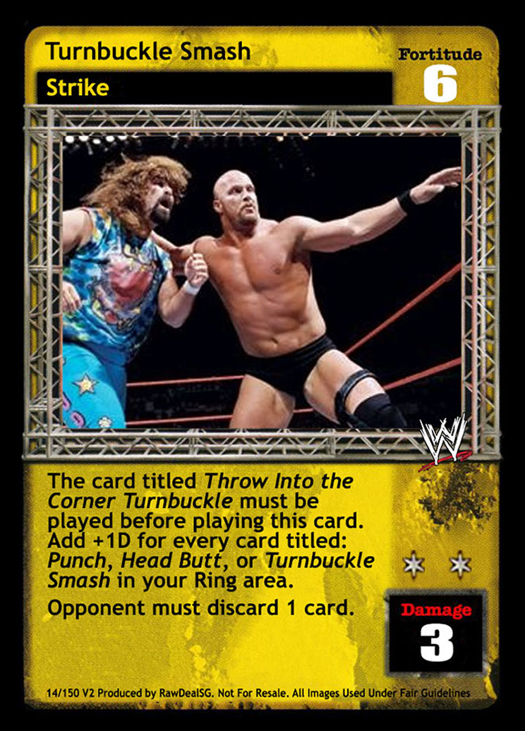 The card titled Throw Into the Corner Turnbuckle must be played before playing this card. Add +1D for every card titled: Punch, Head Butt, or Turnbuckle Smash in your Ring area. Opponent must discard 1 card.