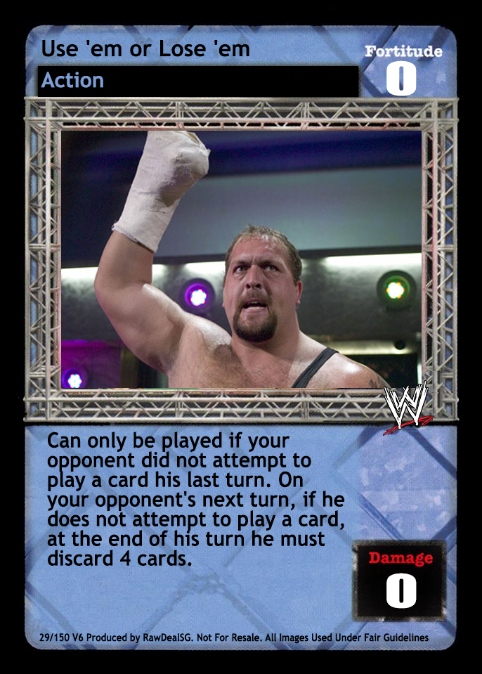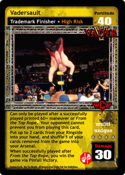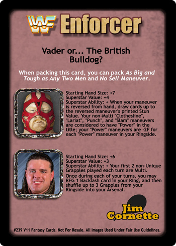 When packing this card, you can pack As Big and Tough as Any Two Men and No Sell Maneuver. Starting Hand Size: +7 Superstar Value: +4. Superstar Ability: + When your maneuver is reversed from hand, draw cards up to the reversed maneuver's printed Stun Value. Your non-Multi 'Clothesline', 'Lariat', 'Punch', and 'Slam' maneuvers are considered to have 'Power' in the title; Your 'Power' maneuvers are -2F for each 'Power' maneuver in your Ringside. Starting Hand Size: +6. Superstar Value: +3. Superstar Ability: + Your first 2 non-Unique Grapples played each turn are Multi. Once during each of your turns, you may RFG 1 Backlash card in your Ring, and then shuffle up to 3 Grapples from your Ringside into your Arsenal.