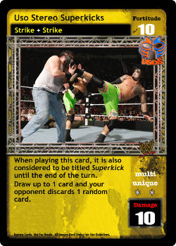 When playing this card, it is also considered to be Superkick until the end of the turn. Draw up to 1 card and your opponent discards 1 random card.
