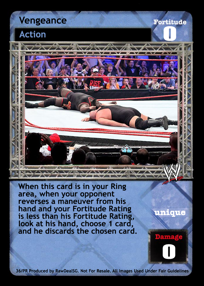 Cannot be played by The Rock. Can only be played if your Fortitude Rating is less than your opponent's Fortitude Rating. As an action, count the number of cards in your hand, and discard them all. Then shuffle an equal number of cards from your Ringside pile into your Arsenal. As a reversal, if played from your hand, can reverse any type of maneuver but you must first discard your hand. End your opponent's turn.