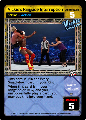 This card is +1D for every Smackdown card in your Ring. When this card is in your Ringside or RFG, and you unsuccessfully play a card, you may put this into your hand.