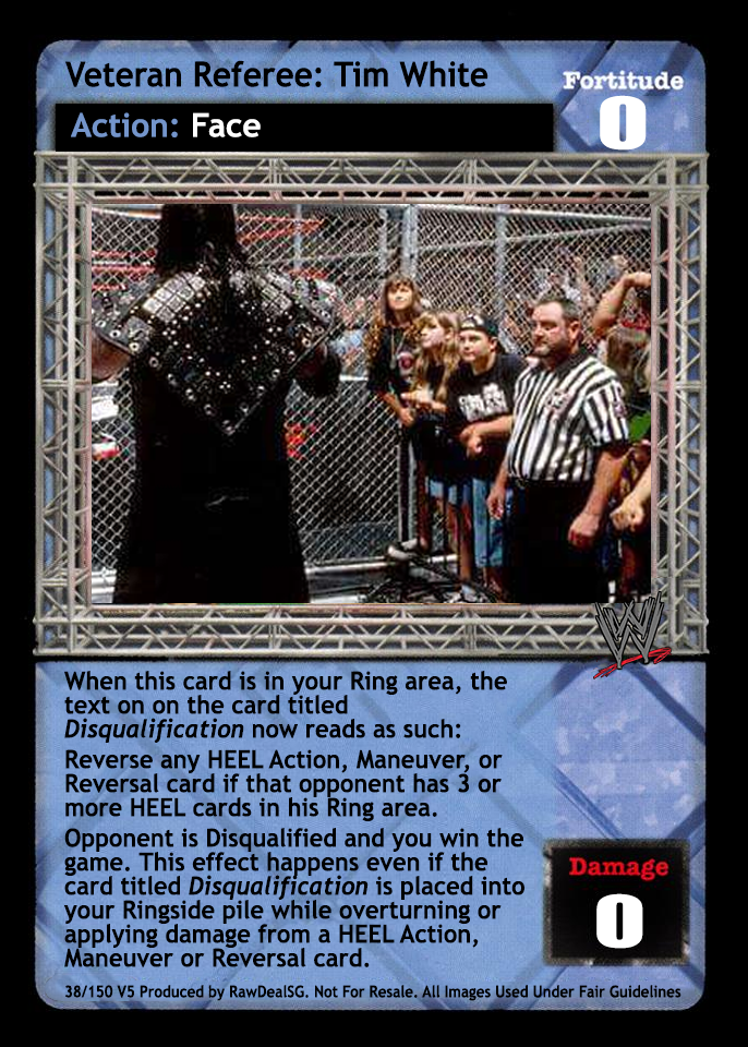 When this card is in your Ring area, the text on on the card titled Disqualification now reads as such: Reverse any HEEL Action, Maneuver, or Reversal card if that opponent has 3 or more HEEL cards in his Ring area. Opponent is Disqualified and you win the game. This effect happens even if the card titled Disqualification is placed into your Ringside pile while overturning or applying damage from a HEEL Action, Maneuver or Reversal card.