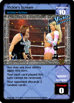 Cannot be played when any player is Vince McMahon, The Genetic Jackhammer, or The McMahon Dynasty. When your opponent plays an Action, he overturns 2 cards. ACE: During your turn, you may put this card into your Ringside and then search your Arsenal for What A Maneuver!, reveal it, put it in your hand, and shuffle your Arsenal; when this effect is reversed, your turn does not end.
