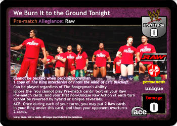 Cannot be packed when packing more than 1 copy of The King Interferes! or From the Mind of Eric Bischoff. Can be played regardless of The Boogeyman's Ability. Ignore the 'You cannot play Pre-match cards' text on your Raw Pre-match cards, and your first non-Unique Raw Action of each turn cannot be reversed by hybrid or Unique reversals. ACE: Once during each of your turns, you may put 2 Raw cards in your Ring under this card, and then your opponent overturns 2 cards.