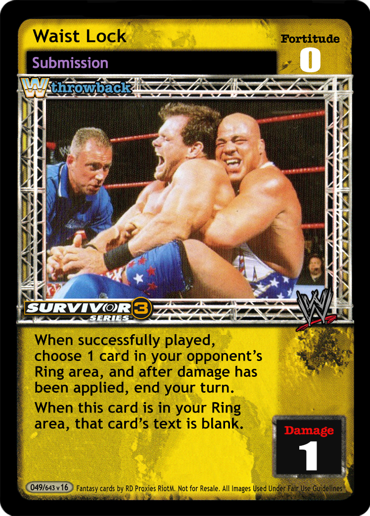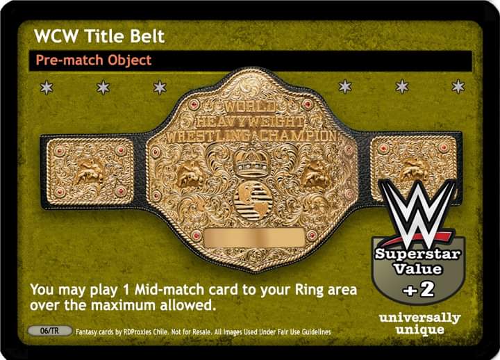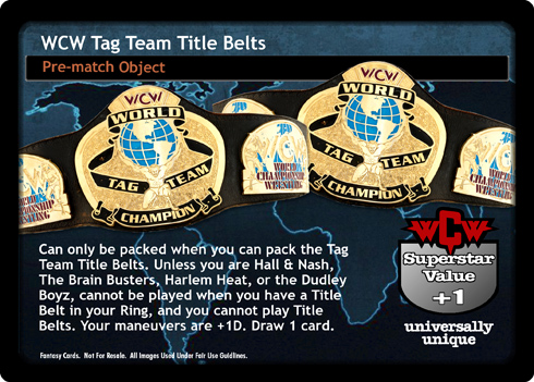 Can only be packed when you can pack the Tag Team Title Belts. Cannot be played when you have a Title Belt in your Ring. ßUnless you are Hall and Nash, The Brain Busters, Harlem Heat, or the Dudley Boyz, you cannot play Title Belts. ßYour maneuvers are +1D. ß Draw 1 card. Superstar Value +1