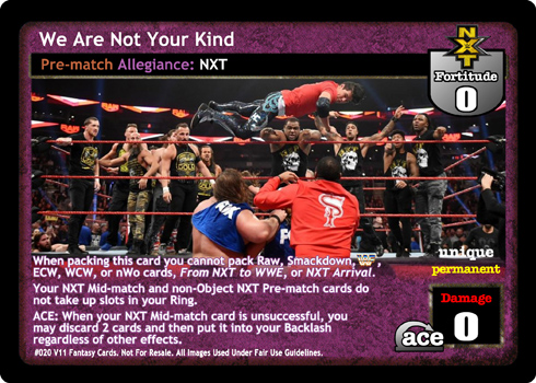 When packing this card you cannot pack Raw, Smackdown, Classic WWF, ECW, WCW, or nWo cards, From NXT to WWE, or NXT Arrival. Your NXT Mid-match and non-Object NXT Pre-match cards do not take up slots in your Ring. ACE: When your NXT Mid-match card is unsuccessful, you may discard 2 cards and then put it into your Backlash regardless of other effects.