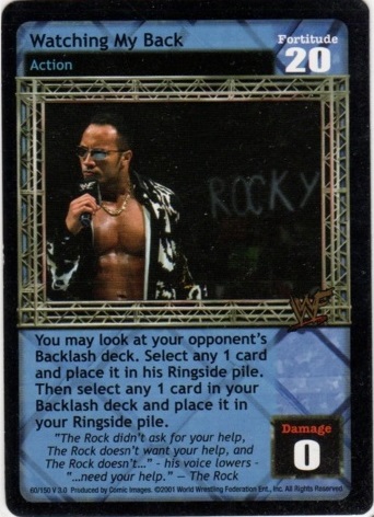 You may look at your opponent's Backlash deck. Select any 1 card and place it in his Ringside pile. Then select any 1 card in your Backlash deck and place it in your Ringside pile. You may look at your opponent's Backlash deck. Select any 1 card and place it in his Ringside pile. Then select any 1 card in your Backlash deck and place it in your Ringside pile.