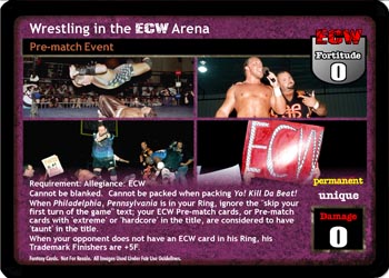 Requirement: Allegiance: ECW. Cannot be blanked. Cannot be packed when packing Yo! Kill Da Beat!. When Philadelphia, Pennsylvania is in your Ring, ignore the 'skip your first turn of the game' text; your ECW Pre-match cards, or Pre-match cards with 'extreme' or 'hardcore' in the title, are considered to have 'taunt' in the title. When your opponent does not have an ECW card in his Ring, his Trademark Finishers are +5F.