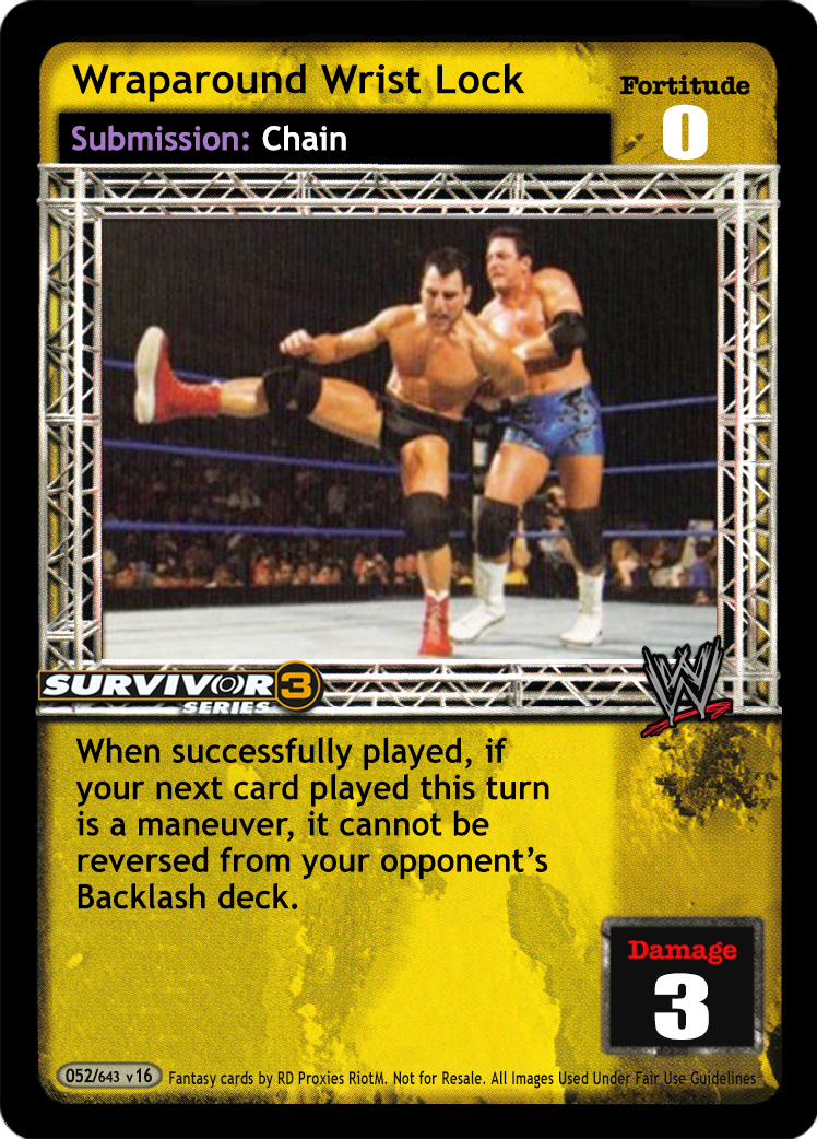 Cannot be packed when you can pack Tag Team Title Belts. This card is considered to have 'old school' in the title. When Back to Basics is in your Ring, your Starting Hand Size is +2; when your Fortitude Rating is 0 and you play a maneuver from under that card 'as if from hand', your opponent cannot play non-Unique reversals to it. Superstar Value +3