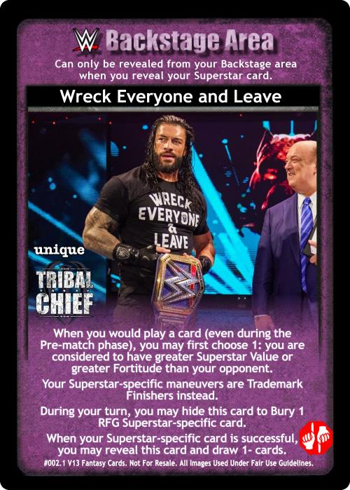 When playing a card (even during the Pre-match phase), you may choose 1: you are considered to have greater Superstar Value or greater Fortitude than your opponent. Your Superstar-specific maneuvers are Trademark Finishers instead. During your turn, you may hide this card to Bury 1 RFG Superstar-specific card. When your Superstar-specific card is successful, you may reveal this card and draw 1- cards.