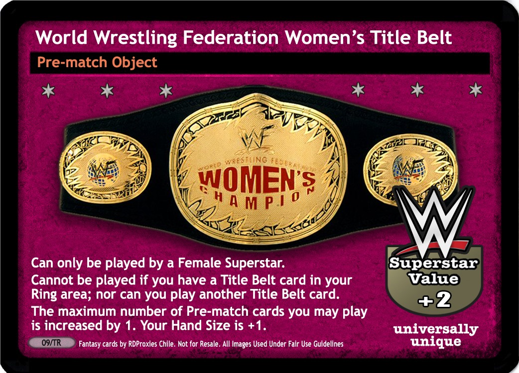 Can only be played by a Female Superstar. Cannot be played if you have a Title Belt card in your Ring area; nor can you play another Title Belt card. Your Hand Size is +1 The maximum number of Pre-match cards you may play is increased by 1. Superstar Value +2
