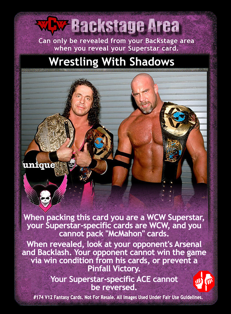 When packing this card you are a WCW Superstar, your Superstar-specific cards are WCW, and you cannot pack 'McMahon' cards. When revealed, look at your opponent's Arsenal and Backlash. Your opponent cannot win the game via win condition from his cards, or prevent a Pinfall Victory. Your Superstar-specific ACE cannot be reversed.