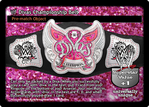 Can only be packed by a Diva. ßWhen you successfully play a card with µdiva' in the text, put 1 card from your Ringside on the bottom of your Arsenal. ßYour non-Run-in Action cards with µdiva' in the text are F: 0 and when successfully played draw 1 card. Superstar Value +1