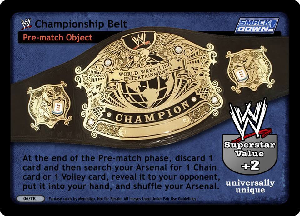 Cannot be packed by Female Superstars. Reveal your hand to your opponent and if you have the cards titled Candice: Internet Icon, Christy: Curvy Cutie, Lilian: Amazing Announcer, Maria: Ideal Interviewer, Melina: Naughty Manager, and Sharmell: Sizzling Spouse in your hand, you win the game via Pinfall Victory.
