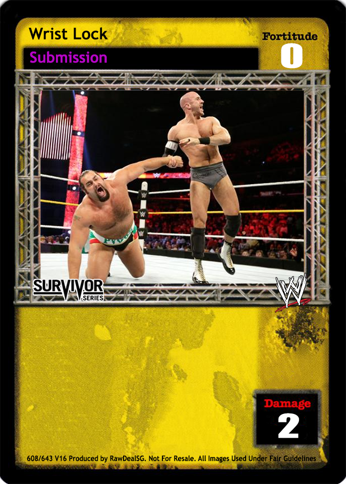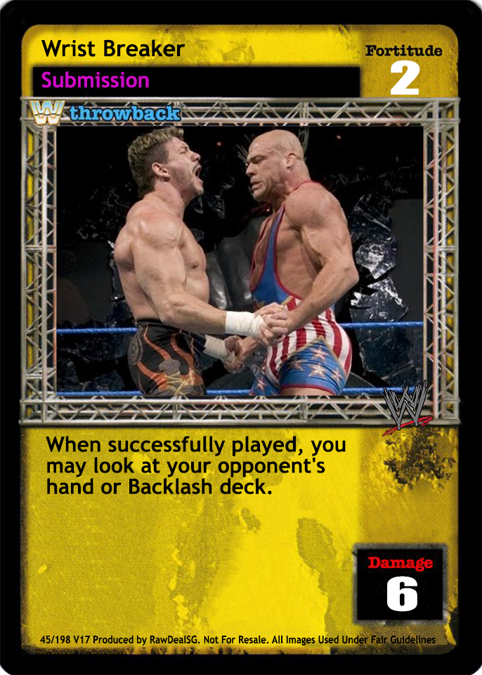 Once during each of your turns, you may search your Arsenal for 1 card titled Back Breaker Torture Rack, Front Chancery, Rolling Headlock Vise, Short Arm Rib Breaker, Super Hold, Superkick, or Suplex, reveal it to your opponent, put it into your hand, and shuffle your Arsenal. You cannot play Backlash deck Reversal cards.