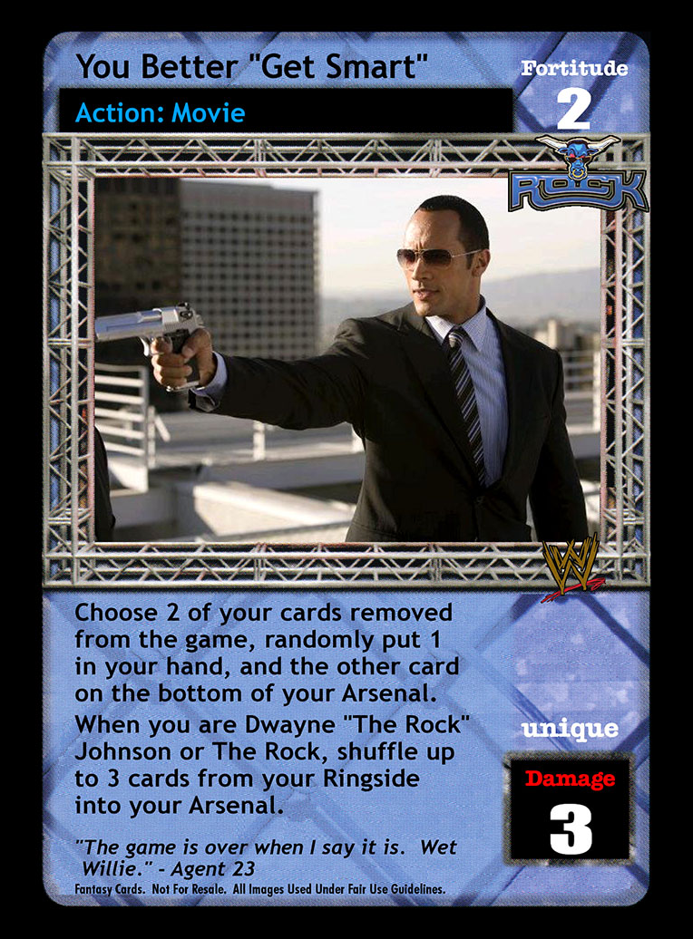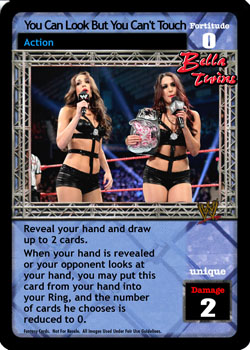Cannot be packed when packing There Is No Escape. When the first card played on your turn is affected by your Ability, your opponent cannot play non-Superstar-specific hybrid reversals to it. When you successfully play a Face or Heel card, you may Promo: 2. During your turn when you have 10+ lower Fortitude, you may hide this card and shuffle all Face or Heel cards in your Ringside into your Arsenal.