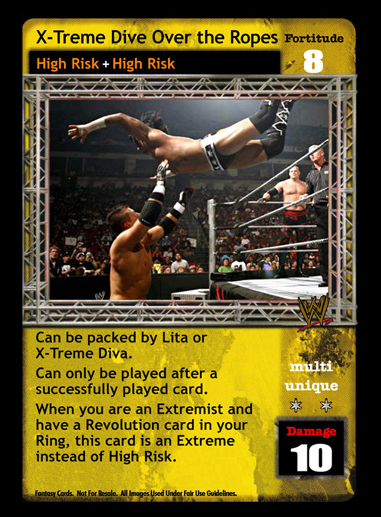 Can be packed by Lita or X-Treme Diva. Can only be played after a successfully played card. When you are an Extremist and have a Revolution card in your Ring, this card is an Extreme instead of a High Risk.