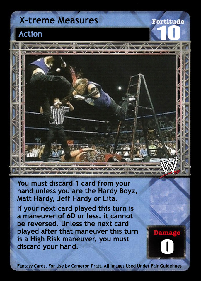 You must discard 1 card from your hand, unless you are the Hardy Boyz, Matt Hardy, Jeff Hardy, or Lita. If your next card played this turn is a maneuver of 6D or less, it cannot be reversed. Unless the next card played after that maneuver this turn is a High Risk maneuver, you must discard your hand.
