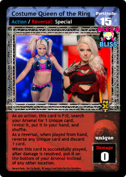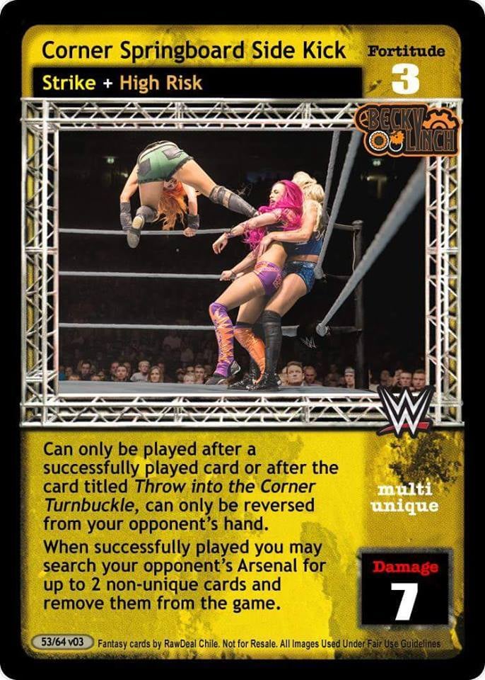 Can only be played after a successfully played card or after the card titled Throw into the Corner Turnbuckle, can only be reversed from your opponent's hand. When successfully played you may search your opponent's Arsenal for up to 2 non-unique cards and remove them from the game.