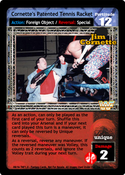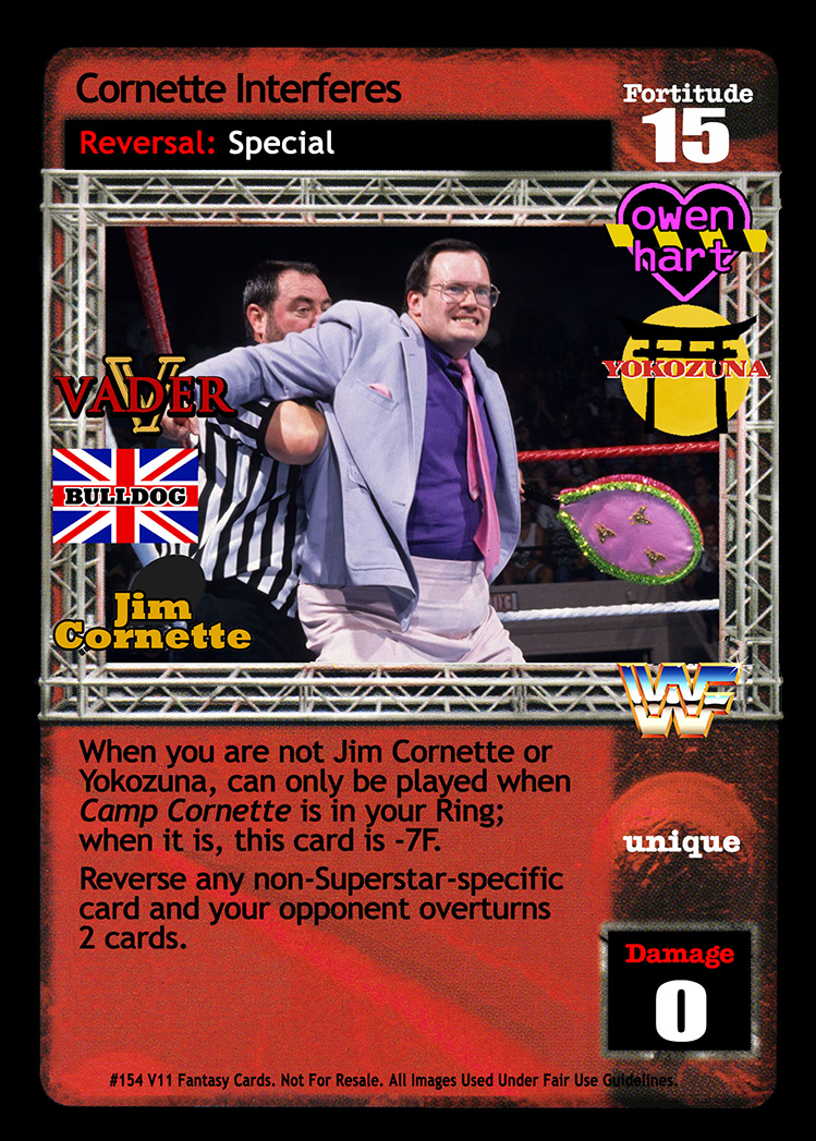 When you are not Jim Cornette or Yokozuna, can only be played when Camp Cornette is in your Ring; when it is, this card is -7F. Reverse any non-Superstar-specific card and your opponent overturns 2 cards.