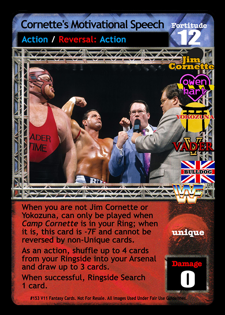 When you are not Jim Cornette or Yokozuna, can only be played when Camp Cornette is in your Ring; when it is, this card is -7F and cannot be reversed by non-Unique cards. As an action, shuffle up to 4 cards from your Ringside into your Arsenal and draw up to 3 cards. When successful, Ringside Search 1 card.