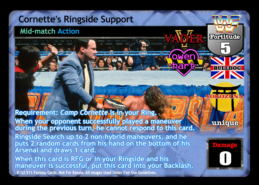 Requirement: Camp Cornette is in your Ring. When your opponent successfully played a maneuver during the previous turn, he cannot respond to this card. Ringside Search up to 2 non-hybrid maneuvers, and he puts 2 random cards from his hand on the bottom of his Arsenal and draws 1 card. When this card is RFG or in your Ringside and his maneuver is successful, put this card into your Backlash.