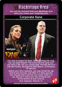 Can only be packed by Kane. When packing this card, you can pack Respect The Authority and cards as if you were a GM, but you cannot pack Through the Fire and the Flames, Managed by Paul Bearer, or Brothers 'til the End. Before your Draw Segment, you may reveal the top card of your Arsenal, and when it is Kane-specific, you may put that card into your hand; when it is not, discard 1 card or put the revealed card on the bottom of your Arsenal. Your Superstar Value is +3.