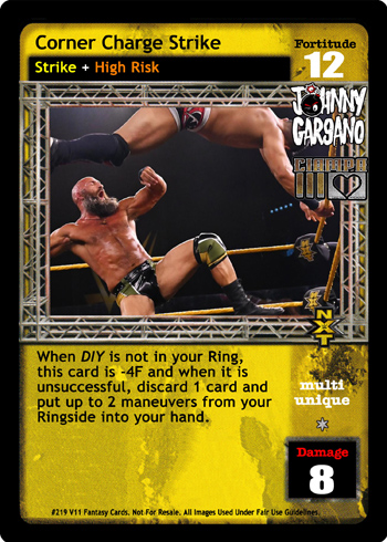 When DIY is not in your Ring, this card is -4F and when it is unsuccessful, discard 1 card and put up to 2 maneuvers from your Ringside into your hand.