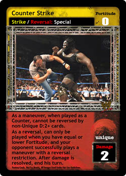 As a maneuver, when played as a Counter, cannot be reversed by non-Unique D:2+ cards. As a reversal, can only be played when you have equal or lower Fortitude, and your opponent successfully plays a maneuver with a reversal restriction. After damage is resolved, end his turn.