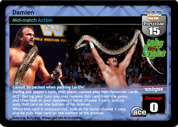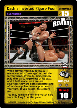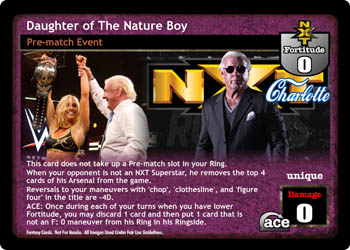 This card does not take up a Pre-match slot in your Ring. When your opponent is not an NXT Superstar, he removes the top 4 cards of his Arsenal from the game. Reversals to your maneuvers with 'chop', 'clothesline', and 'figure four' in the title are -4D. ACE: Once during each of your turns when you have lower Fortitude, you may discard 1 card and then put 1 card that is not an F: 0 maneuver from his Ring in his Ringside.